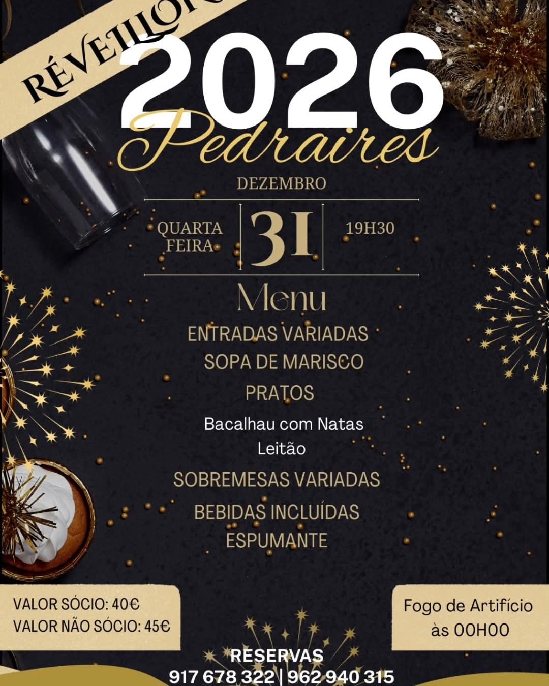 Jantar completo - Bacalhau com natas e leitão - Bebidas incluídas e espumante - Fogo de artifício à meia-noite