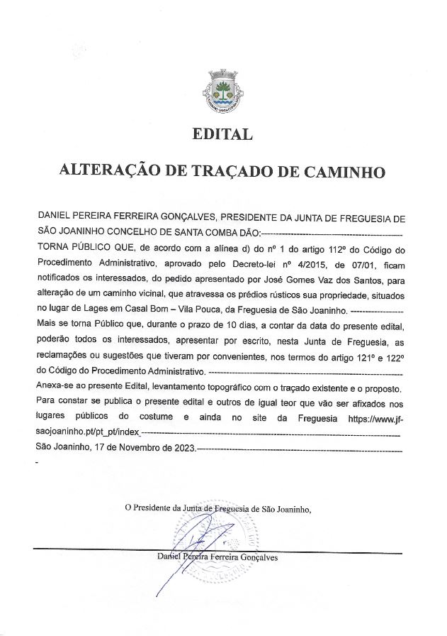 DANIEL PEREIRA FERREIRA GONÇALVES, PRESIDENTE DA JUNTA DE FREGUESIA DE SÃO JOANINHO CONCELHO DE SANTA COMBA DÃO:-TORNA PÚBLICO QUE, de acordo com a alínea d) do n° 1 do artigo 112° do Código do Procedimento Administrativo, aprovado pelo Decreto-lei n° 4/2015, de 07/01, ficam notificados os interessados, do pedido apresentado por José Gomes Vaz dos Santos, para alteração de um caminho vicinal, que atravessa os prédios rústicos sua propriedade, situados no lugar de Lages em Casal Bom - Vila Pouca, da Freguesia de São Joaninho.
